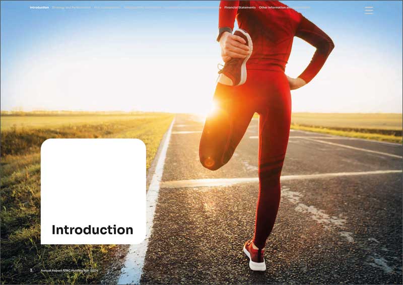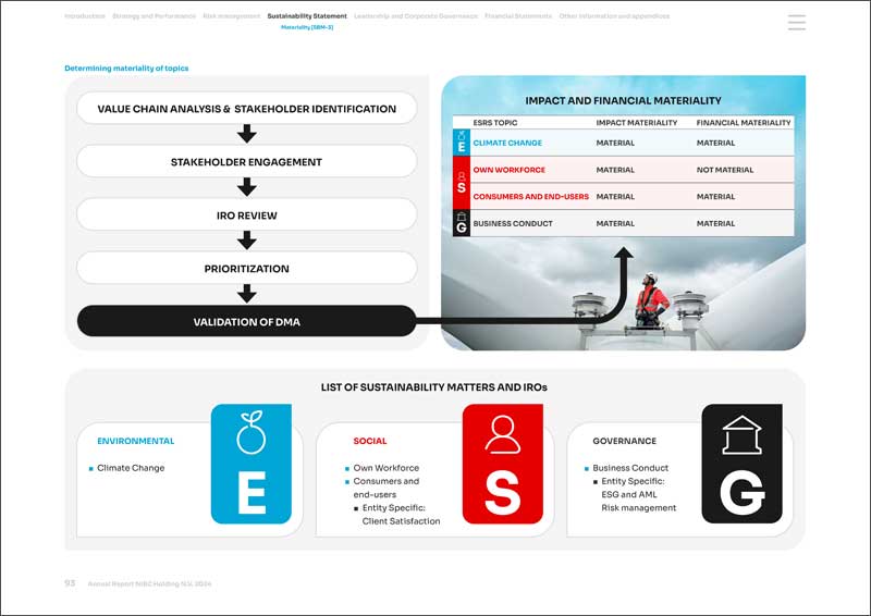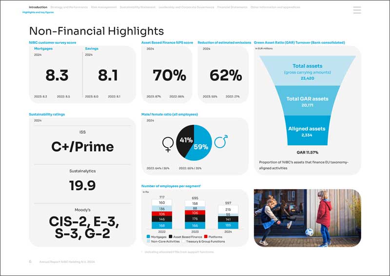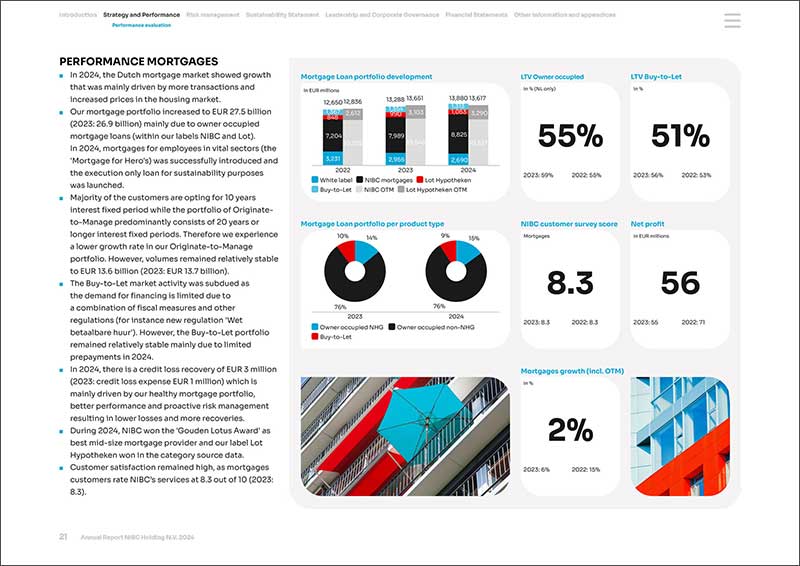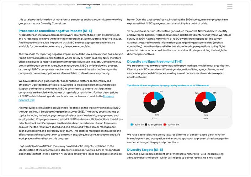 Voor verslagjaar 2024 introduceert NIBC, conform de CSRD-richtlijnen, een uitgebreid hoofdstuk over duurzaamheid. De toevoeging van dit omvangrijke onderdeel vroeg om een vernieuwde opmaak: compacter en beter geschikt voor digitale schermen. Ondanks deze compacte benadering bleven de rapporten omvangrijk: het verslag van Holding telt 262 pagina’s, en dat van Bank zelfs 300. Geen eenvoudige opgave om daar overzichtelijke en verzorgde rapporten van te maken.