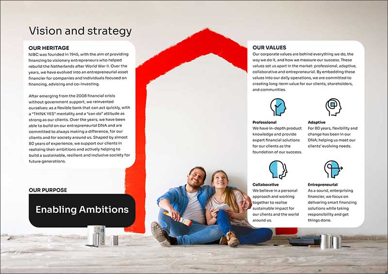 Zo voldoet NIBC niet alleen aan de nieuwste Europese rapportage-eisen, maar levert het ook jaarverslagen op die prettig leesbaar zijn en er representatief uitzien. Echte visitekaartjes voor de organisatie.
